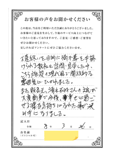 大阪府M様担当者よりこのたびは数ある霊園様・石材店様の中より、墓じまい工事ならびに樹木葬への改葬を当店へご依頼いただき、誠にありがとうございました。